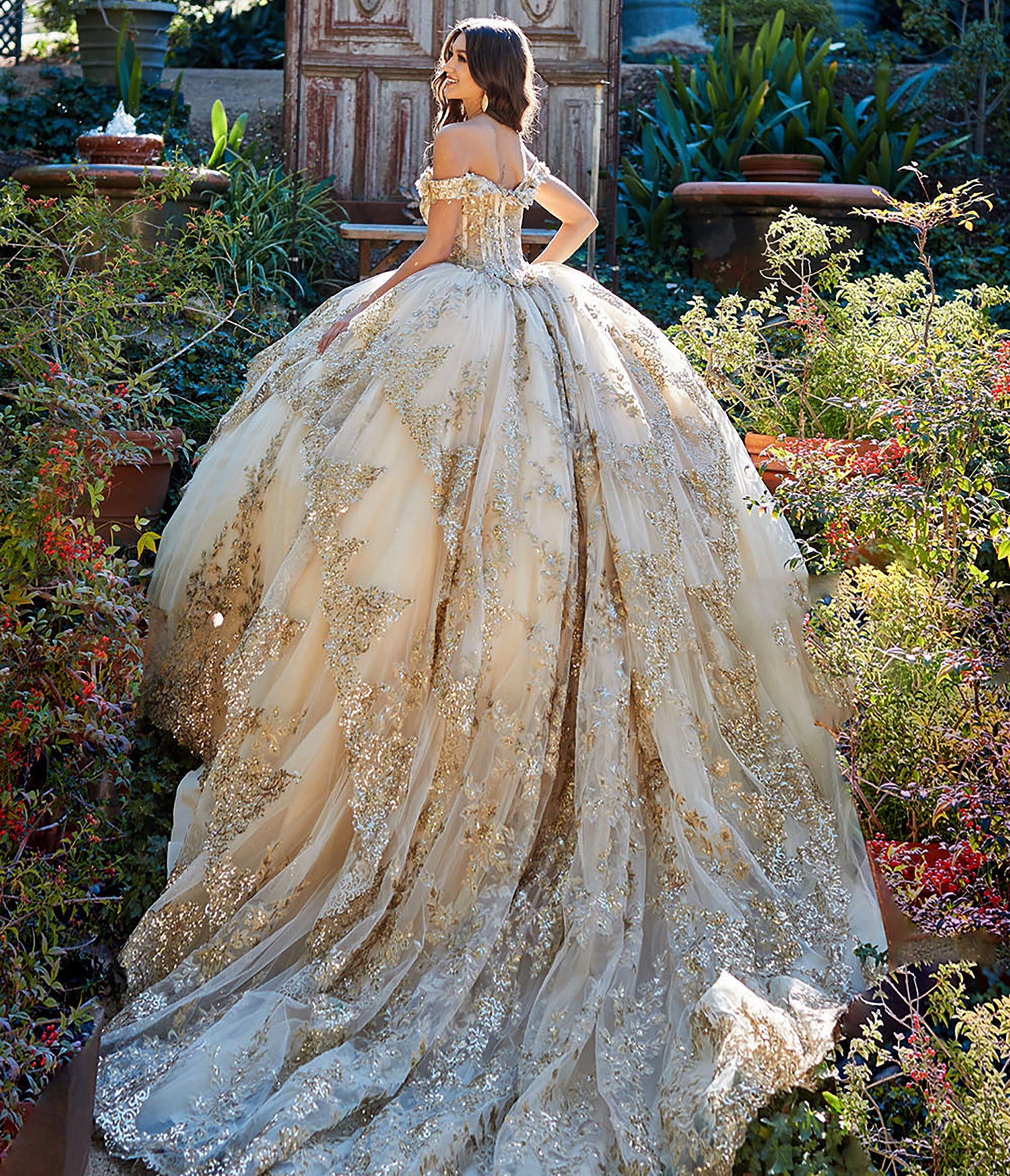 Quinceañera | Rose Gold Off Shoulder Epaulets Sleeve with Detachable Cathedral Tulle Train Quince Ball Gown | Esmeralda dress | 2 Colors Available