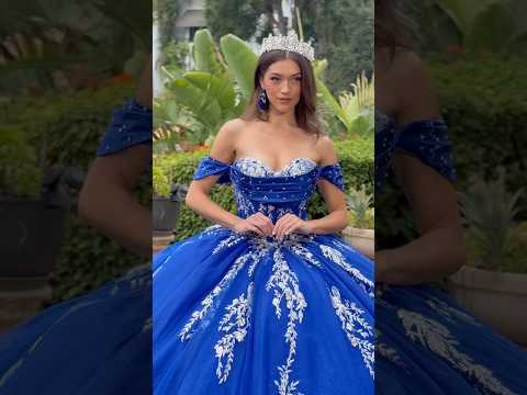 Quinceañera | Blue Ball Gown with Pleated Off-Shoulder Straps, and Glitter Details | Evelisse dress