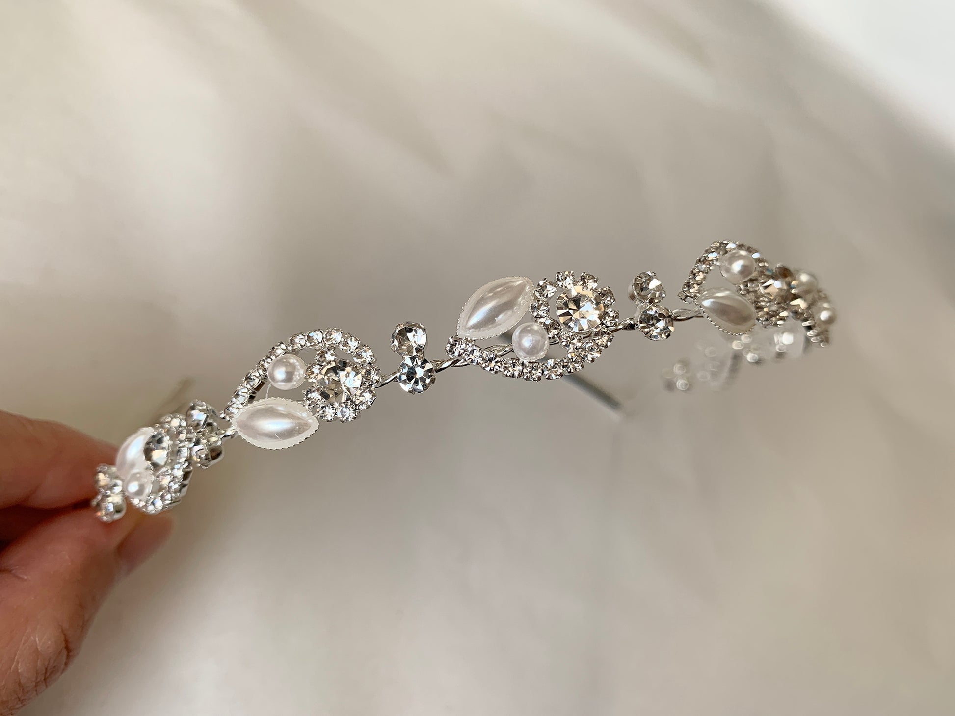 Elegant bridal headpiece adorned with crystals, pearls, and silver rhinestones — perfect for weddings, proms, or any special occasion.