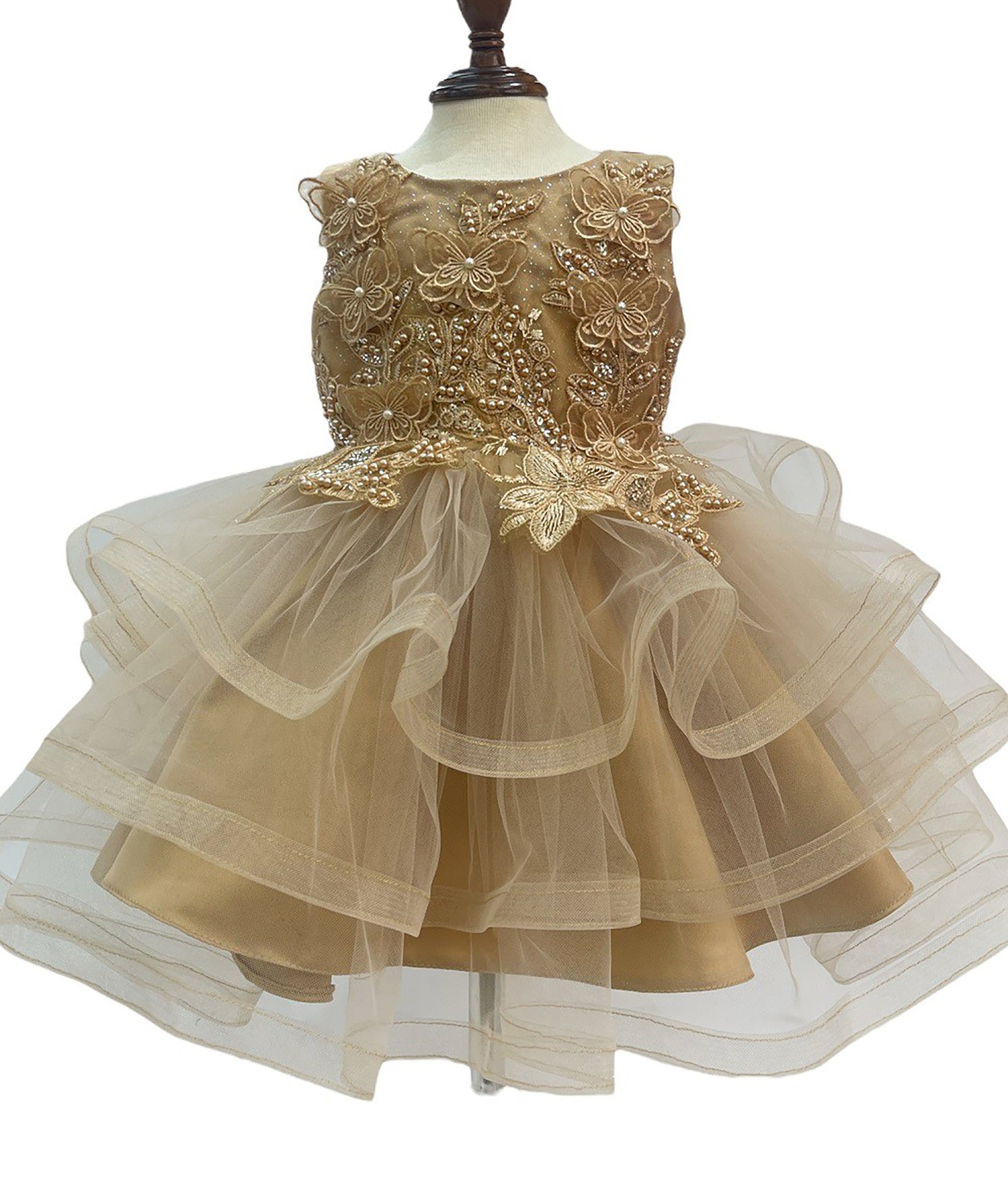 Champagne Baby Toddler Butterfly Pearl Multi-layered Tulle 1st Birthday Party Dress | Everly dress | 4 Colors Available